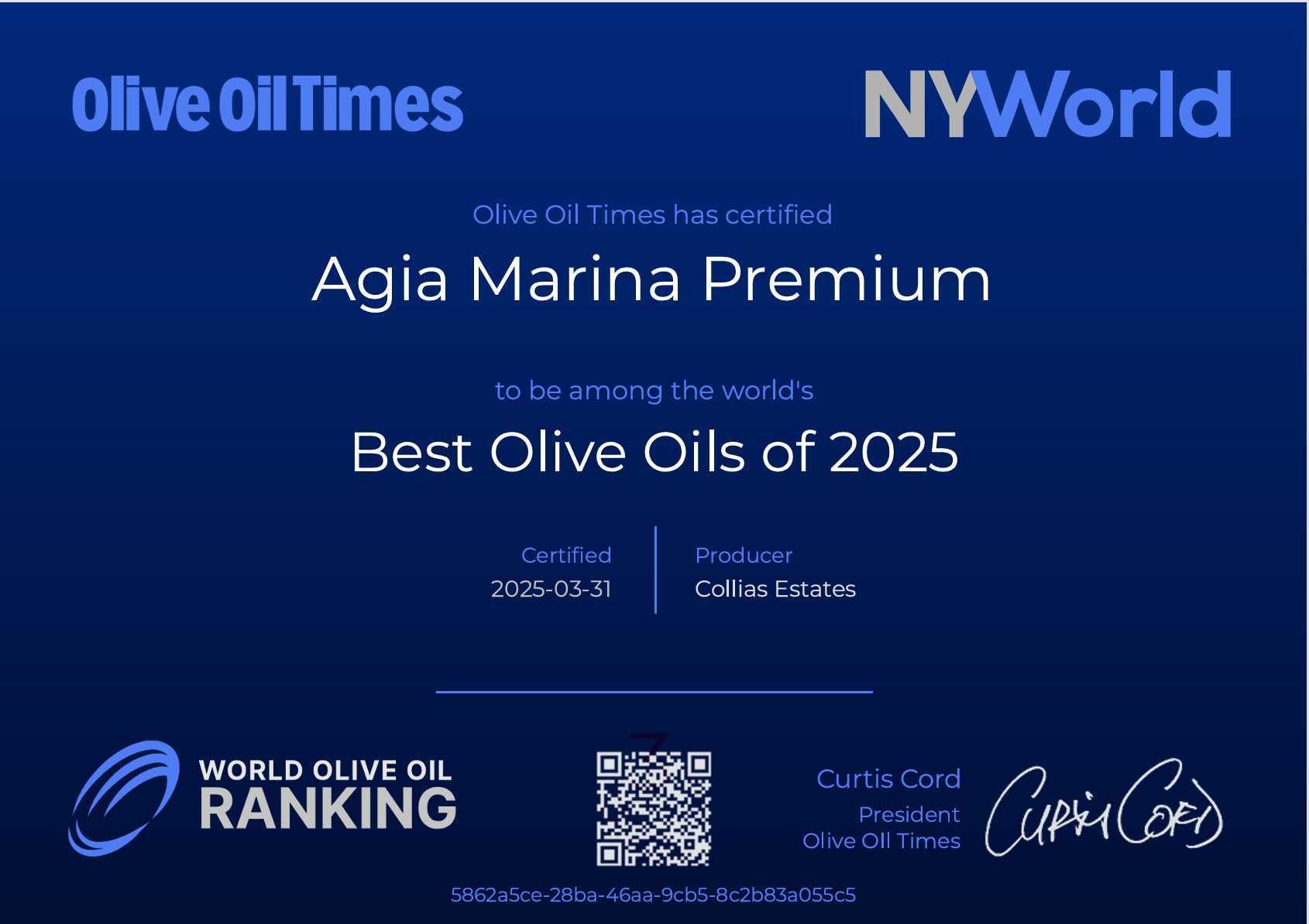 Estate-grown extra virgin olive oil is crafted exclusively from Koroneiki olives outside of the Agia Marina village in Crete, Greece. Single-source, this grove has been in the family for over 100 years. High in polyphenols, this oil is as heart-healthy as it is flavorful. This olive oil has low acidity levels between 0.2 - 0.5%. Each bottle is labeled with the harvest date, guaranteeing freshness. No harmful chemicals or pesticides are ever used.